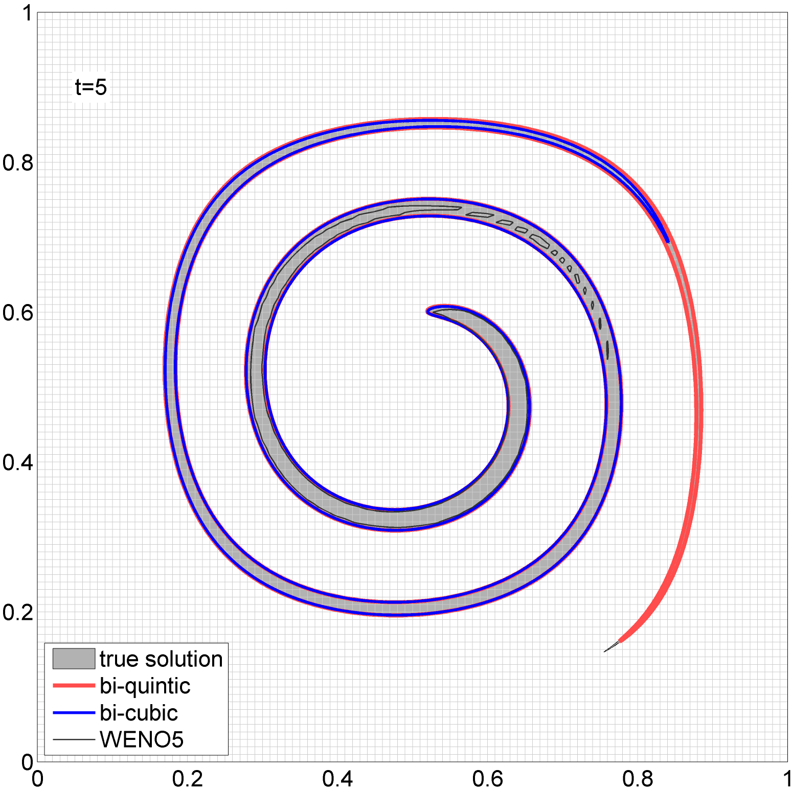 The preceding results demonstrate the accuracy of jet schemes and the GALSM of third order of convergence (i.e., based on bi-cubic interpolation). However, in principle the jet schemes formalism can be extended to arbitrary orders. The figure on the right shows the contours of the 2d deformation field, computed with WENO5 (black), the 3rd order GALSM (blue) and the 5th order GALSM (red). As one can see, the 5th order scheme yields a dramatic improvement over the 3rd scheme: except for a tiny deviation at the slim tail, the true shape (gray) is tracked almost perfectly.